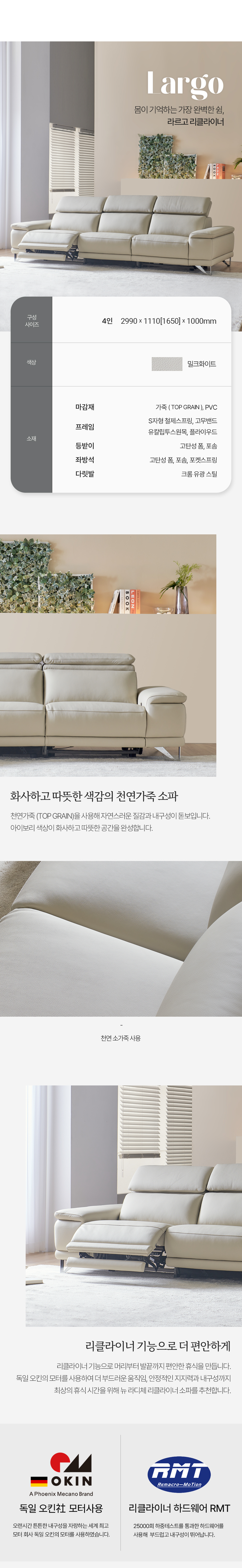 등받이 _ 내부 : 포솜+고탄성폼 , 외피 : 가죽(TOP GRAIN)